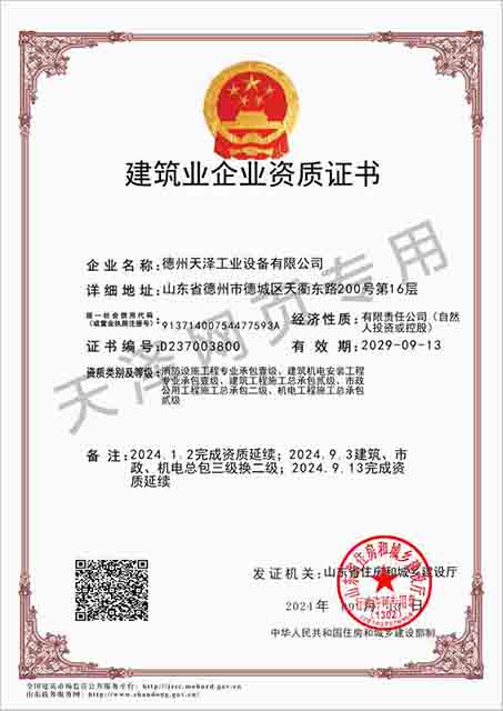 德州天澤工業設備有限公司成立于2003年(前身為德州天元集團天明工業設備安裝公司),經過20多年的發展,現成長為擁有職工600余人,各類專業技術人員近300余人,年生產能力兩億元以上,以建筑機電安裝工程、消防設施安裝工程施工為主,集建筑工程施工、市政工程施工、建筑智能化工程施工、園林綠化工程施工、工程管理服務、物業管理、電氣機械設備銷售等多元化經營于一體的綜合型企業。2005年,企業按照國際標準建立的質量管理體系,通過了ISO質量管理體系認證、環境管理體系認證、職業健康安全管理體系認證。施工工程遍布山東、河北、四川、江蘇等地,最具代表性的工程有:山東省德州市百腦匯資訊廣場機電安裝工程、德州經濟開發區天元大廈機電安裝工程、陵城區人民醫院機電安裝工程、德州金魯班大廈機電安裝工程、河北故城金辰小區機電安裝工程、北川地震災后援建工程等。多年來,公司始終堅持“以人為本,建精品工程,創行業品牌”的經營理念,先后榮獲。ㄊ校┘壧┥奖⑻旄、魯安杯等獎項,申報各種功法、多項專利。